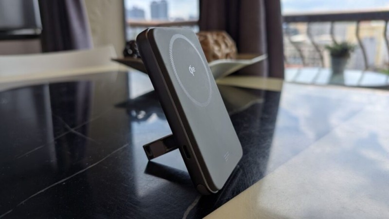 Outra característica interessante do EcoFlow RAPID Magnetic Power Bank é que ele vem com um suporte em forma de clipe integrado. Pode parecer frágil, mas de acordo com meus testes, pode sustentar telefones grandes nas orientações retrato e paisagem.